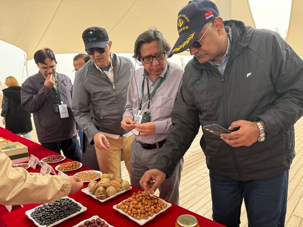Delegation members sampling desert fruits grown in the ecological forest [Photo/Zhao Xiaopeng]