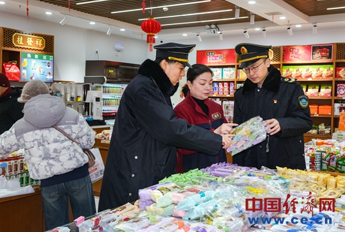 疾控中心工作人员在天津西站内超市对售卖食品进行监督查看。杨宝森/摄
